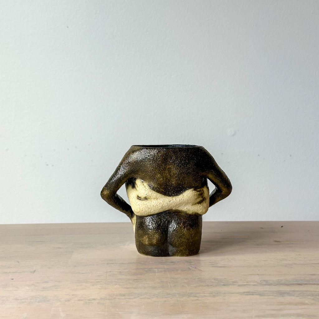 Wheel thrown and altered stoneware vessel depicting figures with fronts pressed together and arms wrapped around each other. One-of-a-kind piece