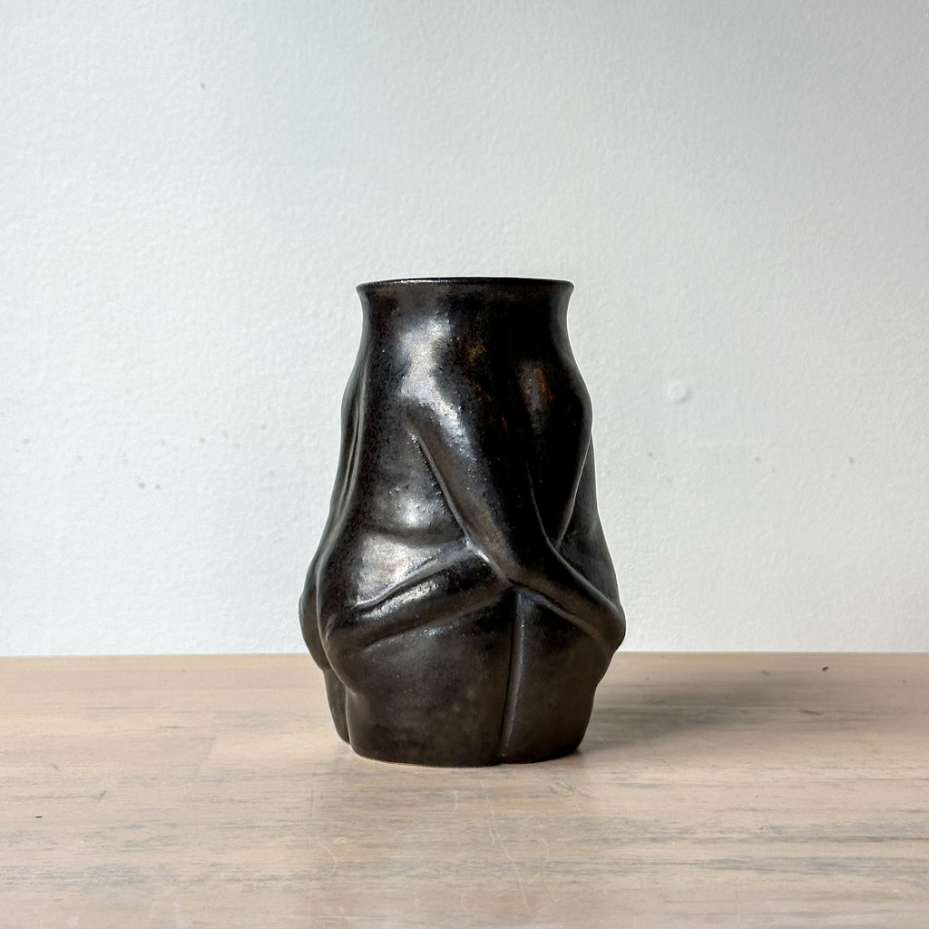 Wheel thrown and altered stoneware vessel depicting figures with arms wrapped around each other. One-of-a-kind piece