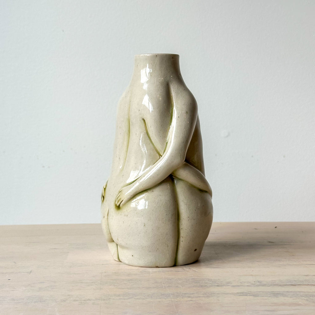 Wheel thrown and altered stoneware vessel depicting figures with arms wrapped around each other. One-of-a-kind piece