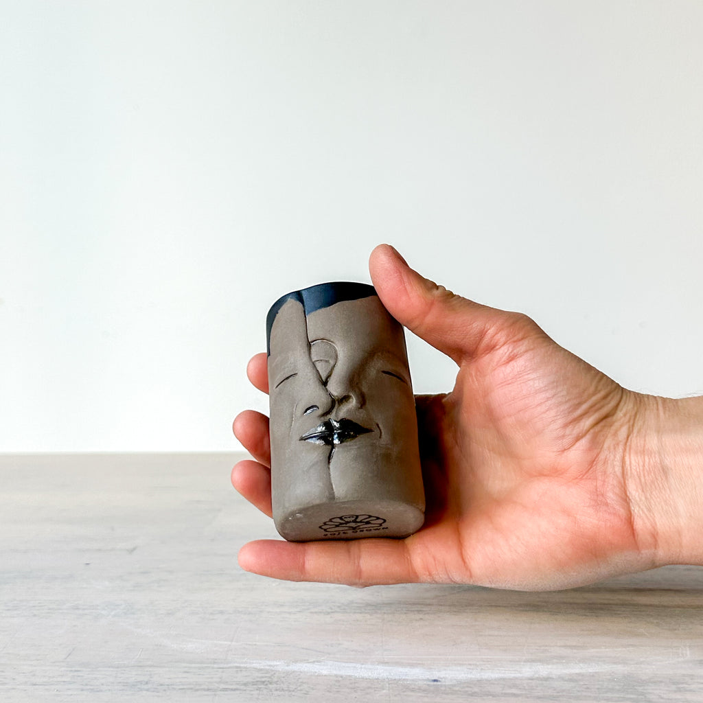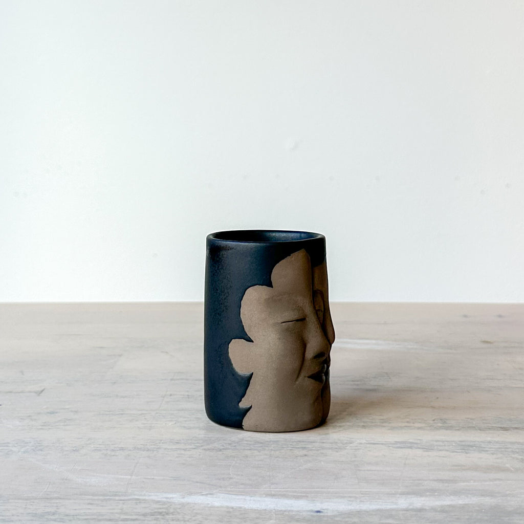 Stoneware cup depicting 2 faces pressed together. Created and cast in my Atlanta studio.
